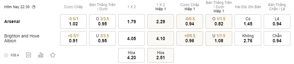Soi kèo hiệp 1 Arsenal vs Brighton: 0.94*0/0.5*0.96