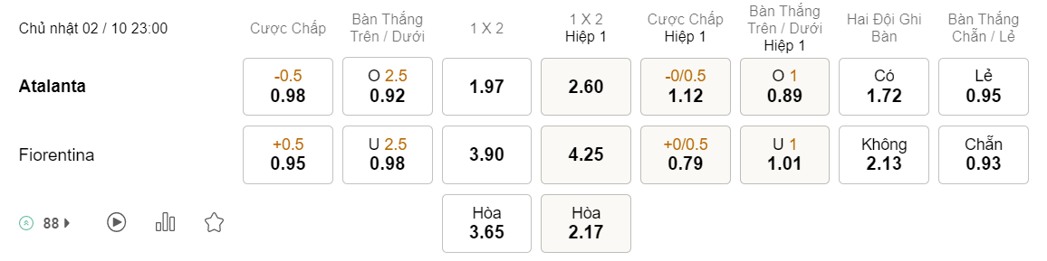 Tỉ lệ kèo Atalanta vs Fiorentina