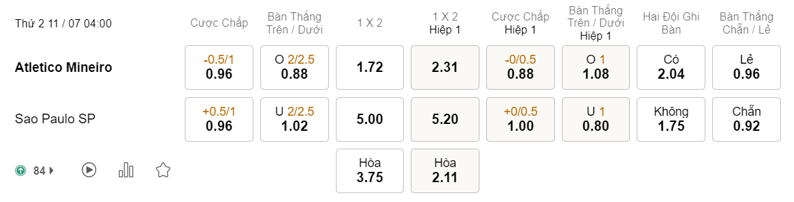 Tỉ lệ kèo Atletico Mineiro vs Sao Paulo