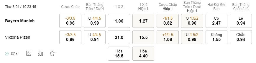 Soi kèo hiệp 1 Bayern vs Viktoria Plzen: 0.82*1/1.5*1.06