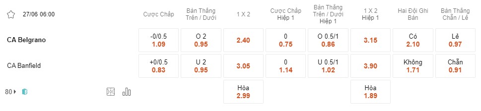Tỉ lệ kèo Belgrano vs Banfield
