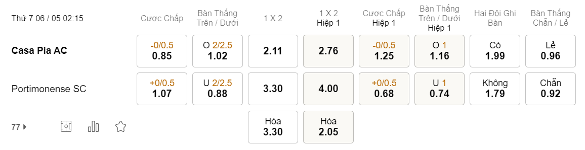 Tỉ lệ kèo Casa Pia vs Portimonense