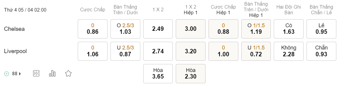 Tỉ lệ kèo Chelsea vs Liverpool