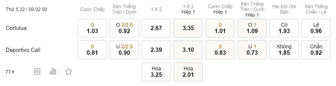 Soi kèo hiệp 1 Cortulua vs Deportivo Cali: 1.01*0*0.83