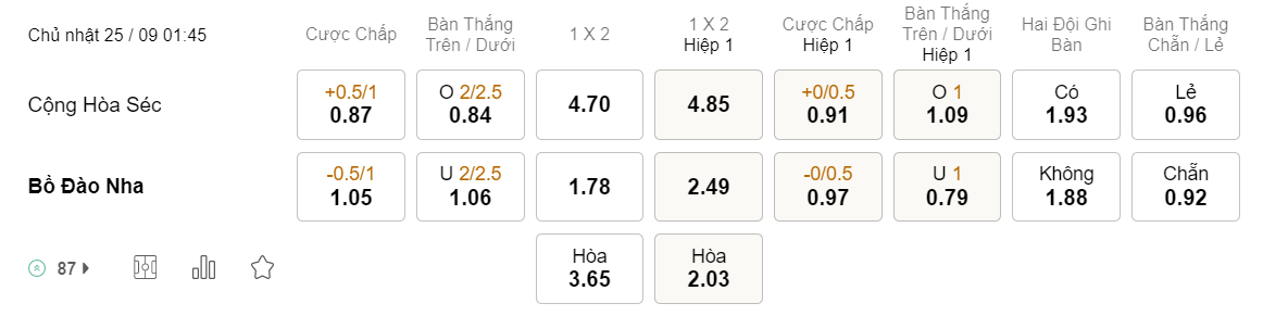 Tỉ lệ kèo Czech vs Bồ Đào Nha