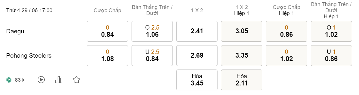 Soi kèo châu Á Daegu vs Pohang Steelers: 0.84*0*1.08