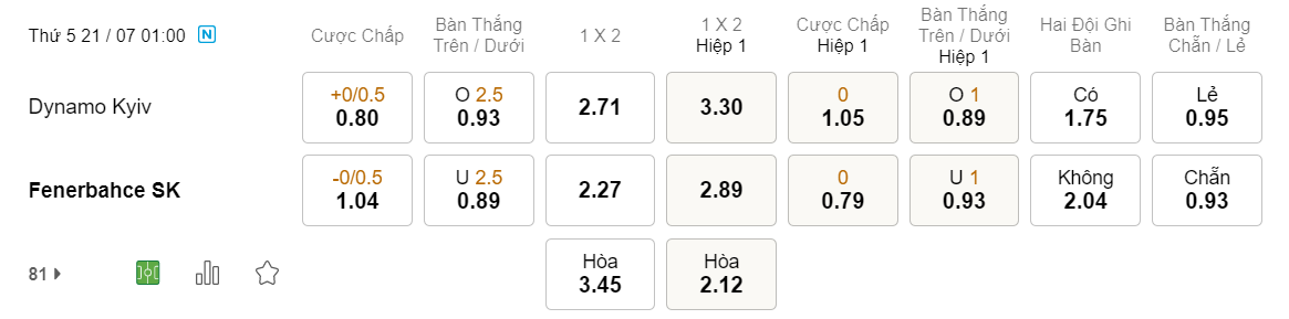 Soi kèo châu Á Dynamo Kyiv vs Fenerbahce: 0.80*0/0.5*1.04
