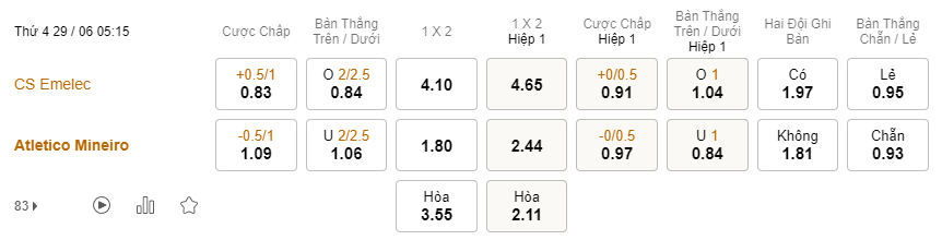 Soi kèo châu Á Emelec vs Atletico Mineiro: 0.83*0.5/1*1.09