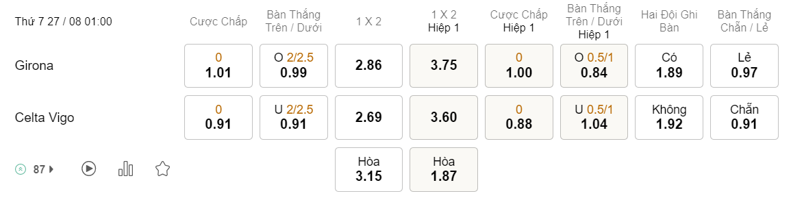 Soi kèo châu Á Girona vs Celta Vigo: 1.01*0*0.91