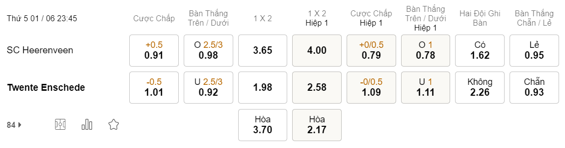 Soi kèo hiệp 1 Heerenveen vs Twente: 0.79*0/0.5*1.09