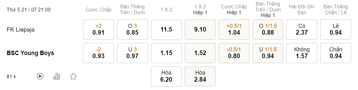 Soi kèo hiệp 1 Liepaja vs Young Boys: 1.04*0.5/1*0.80