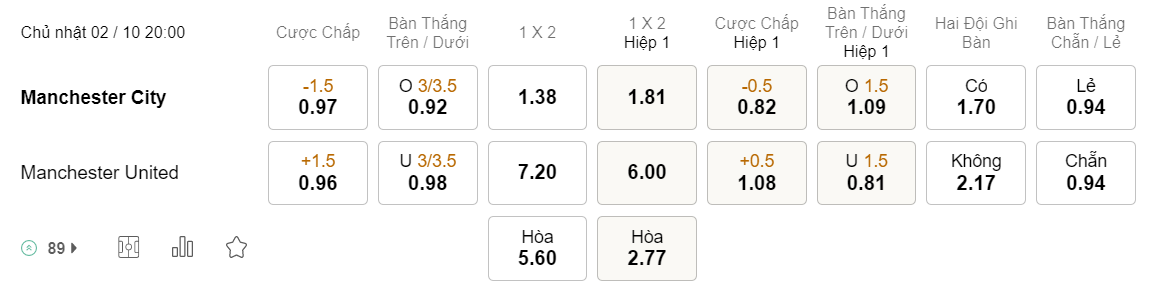 Tỉ lệ kèo Man City vs MU