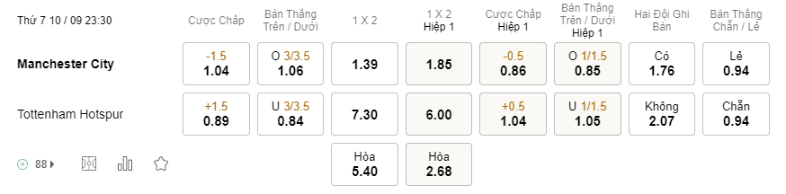 Tỉ lệ kèo Man City vs Tottenham