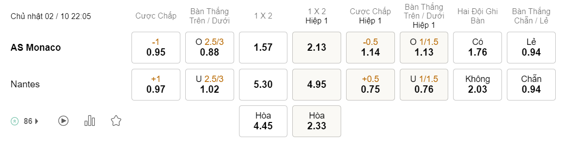 Soi kèo hiệp 1 Monaco vs Nantes: 1.14*0.5*0.75
