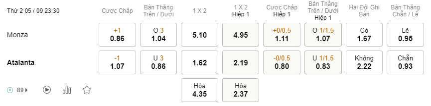 Soi kèo hiệp 1 Monza vs Atalanta: 1.11*0/0.5*0.80