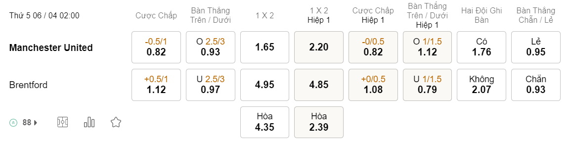 Tỉ lệ kèo MU vs Brentford