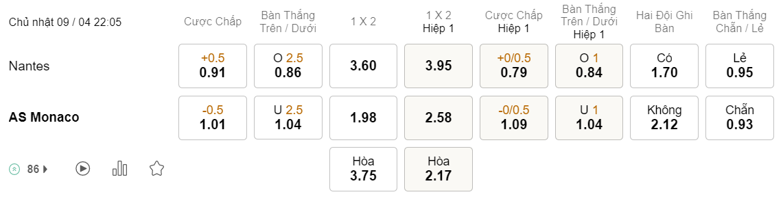 Soi kèo hiệp 1 Nantes vs Monaco: 0.79*0/0.5*1.09