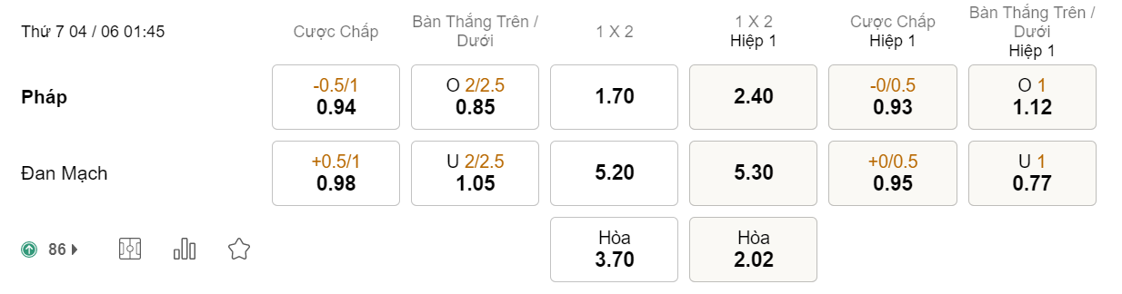 Tỉ lệ kèo Pháp vs Đan Mạch