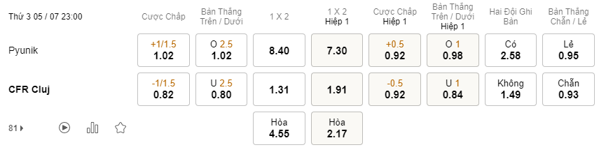 Tỉ lệ kèo Pyunik vs CFR Cluj