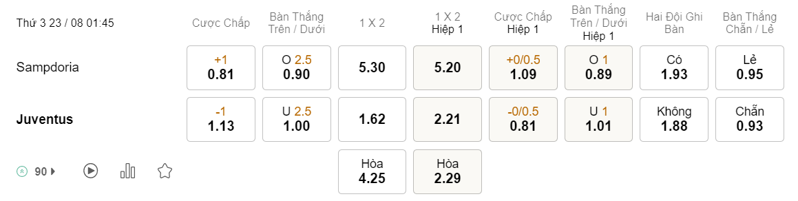 Tỉ lệ kèo Sampdoria vs Juventus