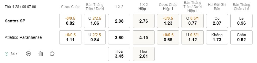 Soi kèo hiệp 1 Santos vs Athletico: 1.23*0/0.5*0.69