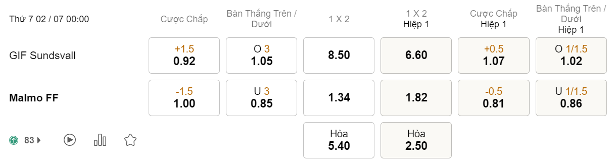 Soi kèo châu Á Sundsvall vs Malmo: 0.92*1.5*1.00