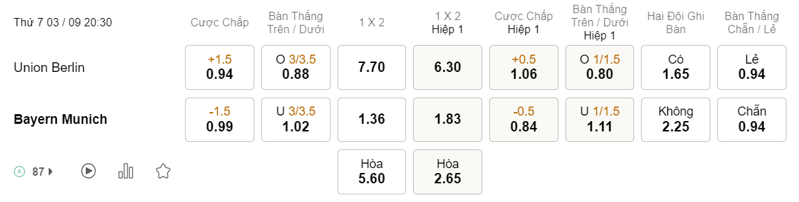Soi kèo hiệp 1 Union Berlin vs Bayern: 1.06*0.5*0.84
