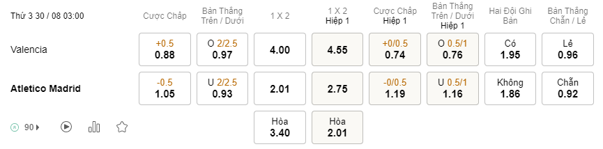 Tỉ lệ kèo Valencia vs Atletico Madrid