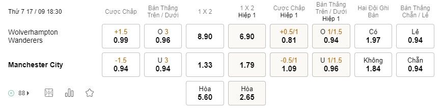 Tỉ lệ kèo Wolves vs Man City